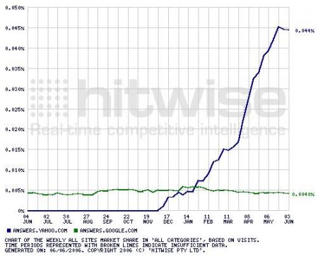One thing that should be noted. Yahoo! Answers has taken off and announced the posting of their 10 millionth question in May. The service has blown by Google Answers, as shown by this chart courtesy of Hitwise and posted on Searchenginewatch (thanks Danny).