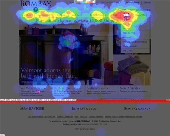 Jakob was demonstrating interaction with the home page of jcpenney.com. (The picture that I’ll be talking about has changed, but the basic page structure is the same). The heat map image showed clearly that the big block graphic, in this case a picture of a bed with a colorful spread, with some promotional text inset in the upper left and the lower right, received virtually no scanning. All the scanning was in the top navigation bar. The large block graphic “fenced in” the scan area, cutting users off from other promotional information that lay below the graphic. We saw the same thing occur with the Bombay Company site in a eyetracking study we did for MarketingSherpa (see below).