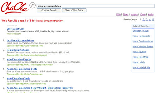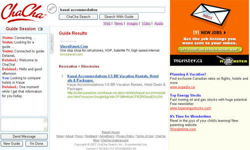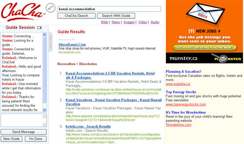 Okay, I’m sure Delaine is an excellent person, kind to kids and animals, and is probably an expert in many areas, but what makes him/her an expert on Kauai? How does Delaine know what I was searching for? Does ChaCha have a room full of people monitoring my initial search activity, and when I click on the guide button, a red light starts flashing and an announcement rings out at Cha Cha Headquarters, “Attention, we need a Kauai Expert on seach 1045..Stat!!” ? I somehow doubt it. Lets put the “knowledgeable” line down to more marketing spin.