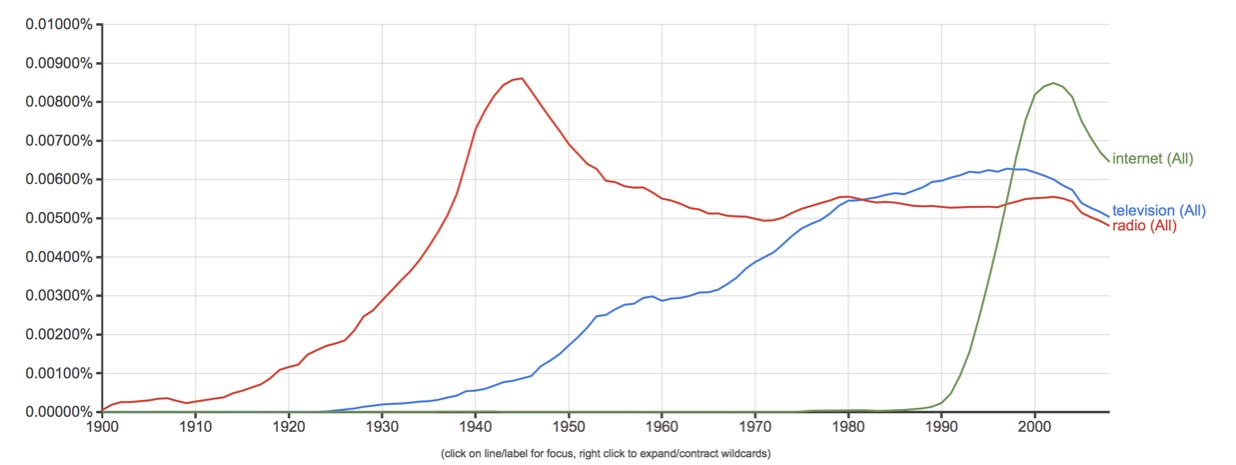 I tried a few charts of my own. Since 1885, “Evolution” has beaten “Creation,” but it took a noticeable drop during the 30’s. Since 1960 both have been on the rise. In1980, Apple got off to an initial head start, but Microsoft passed it in 1992, never to look back (although it’s had a precipitous decline since 2000.) Perhaps the most interesting chart is comparing “radio”, “television” and “internet” since 1900. Radio started growing in the 20’s and hit its popularity peak around 1945, but the cross-over with television would take another 40 years (about 1982.) Television would only enjoy a brief period of dominance. In 1990, the meteoric rise of the Internet started and it surpassed both radio and television around 1997.