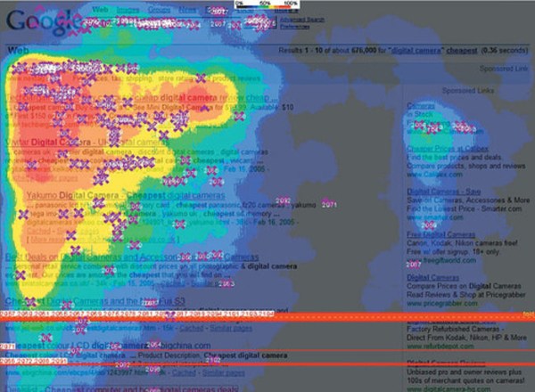 The top of the results, especially the top left corner, is the most heavily scanned part of the results page. Google seemed to be the most dedicated of all the three engines in ensuring the results that fall in this real estate are highly relevant to the query. For example, Google served up top sponsored ads in far fewer sessions in the study than did either Yahoo or MSN.